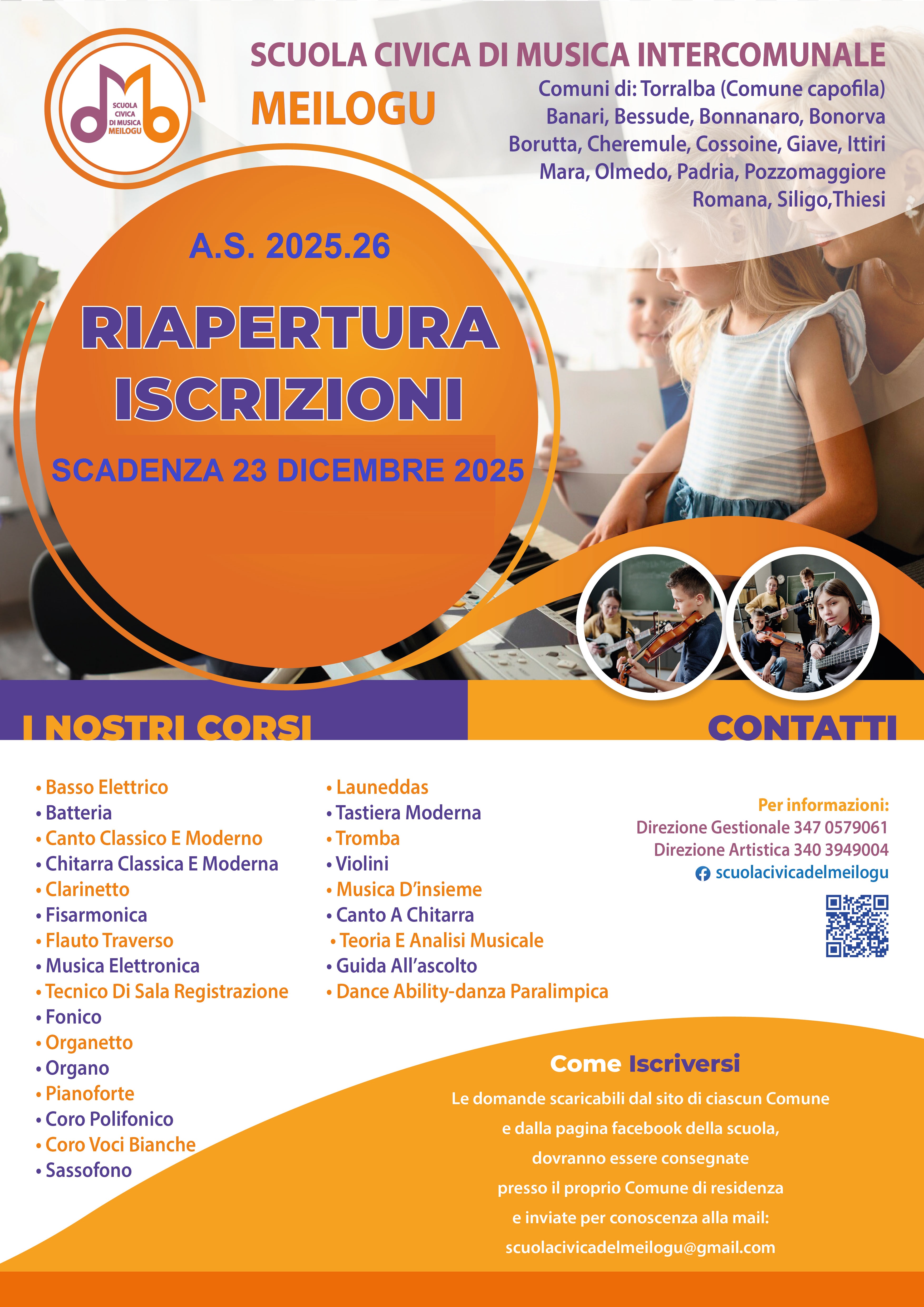 Si informano tutti gli interessati che sono aperte le iscrizioni ai corsi strumentali della Scuola Civica di Musica "Meilogu" per l'anno scolastico 2025/2026. I dettagli sono riportati nella locandina e modulistica allegati al presente comunicato.