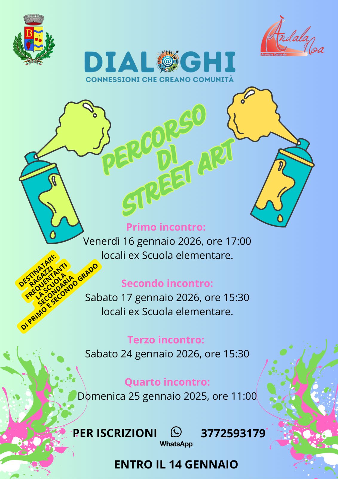 Si informa che sono aperte le iscrizioni al percorso di street art, destinato ai ragazzi frequentanti le Scuole Secondarie di primo e secondo grado. Le modalità di adesione sono indicate nella locandina, allegata al presente comunicato.